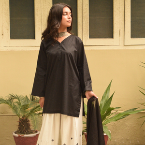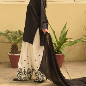 The Siyah Set from Venera’s Farshi Edit captures the essence of timeless tradition with a modern edge. Featuring a deep black kurta paired with ivory wide-leg trousers adorned with intricate black embroidery, this outfit blends minimal sophistication with artisanal detail. The soft black dupatta completes the ensemble, making it versatile for both casual and semi-formal wear.