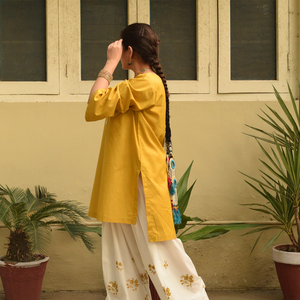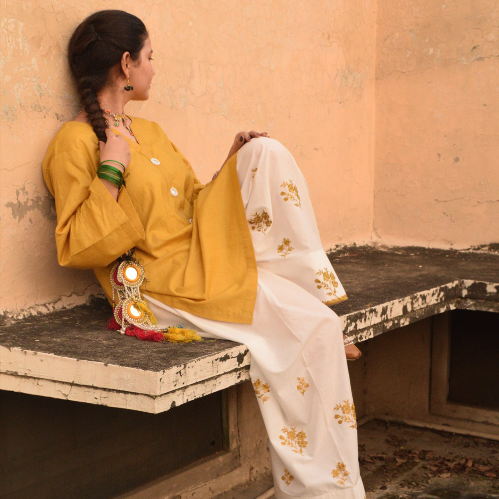 The Suraj Mukhi Set from Venera’s Farshi edit is a radiant expression of tradition and modern charm. The mustard-hued kurta, highlighted with statement white buttons, pairs beautifully with ivory trousers detailed in delicate mustard floral embroidery. Perfect for day-to-day elegance or festive gatherings, this ensemble brings warmth, comfort, and sophistication together.